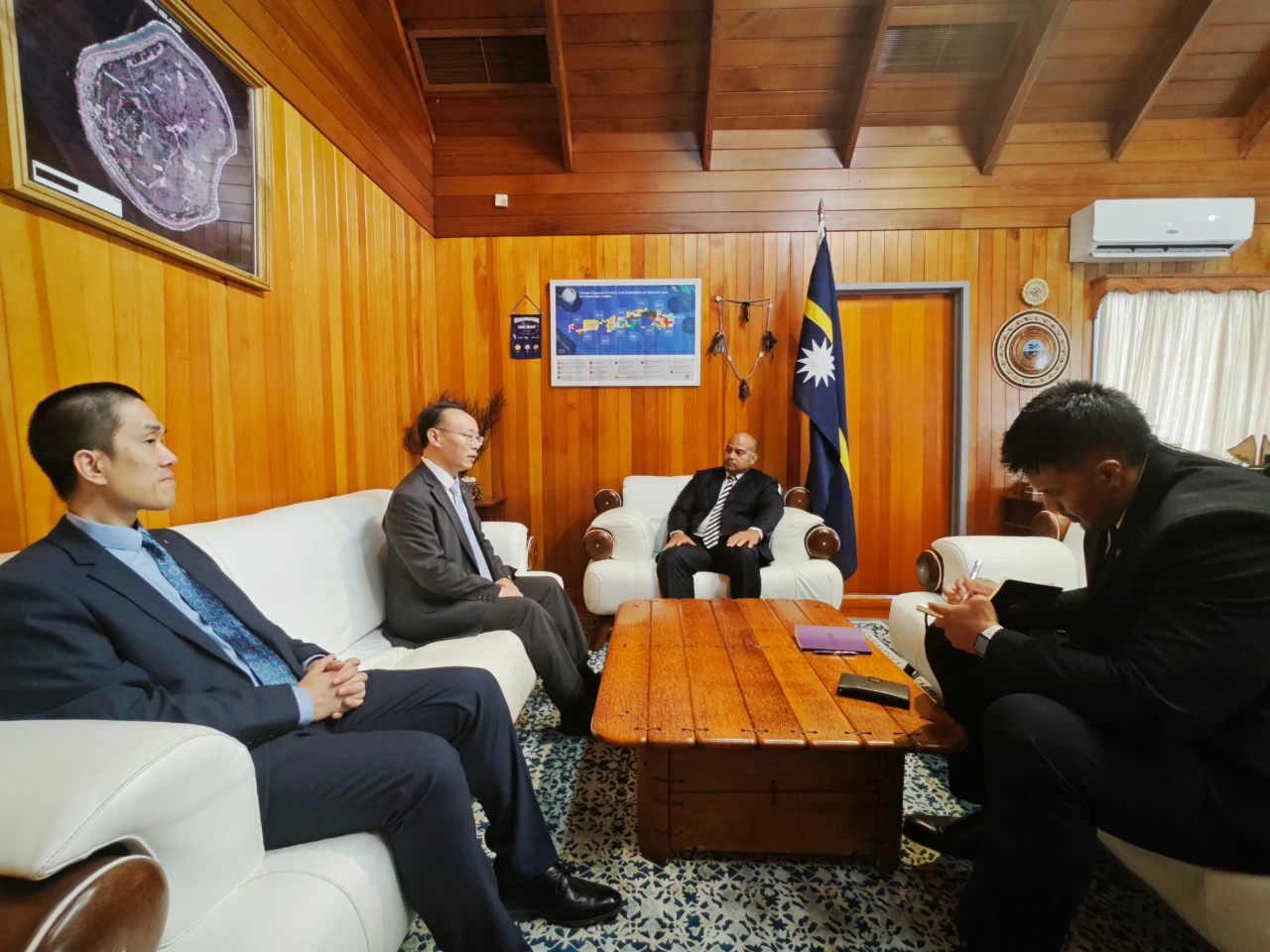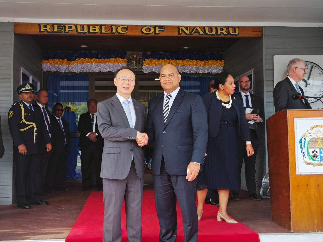 1月31日,驻瑙鲁大使吕进受邀出席瑙鲁独立57周年庆典仪式,并拜会瑙总统阿迪昂。
