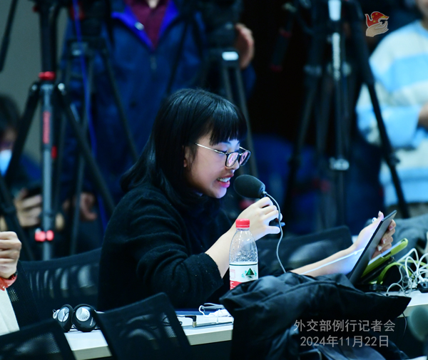 俄新社记者:俄罗斯总统普京昨天表示,作为对乌克兰军队使用美国和英国远程武器的回应,俄军对乌克兰国防工业综合体设施发动了混合打击。普京还表示,在战斗条件下测试了俄罗斯新型中程弹道导弹“榛树”。这次是携带非核弹头的中程弹道导弹。普京也强调乌克兰冲突已经具有全球性。外交部对此有何评论?