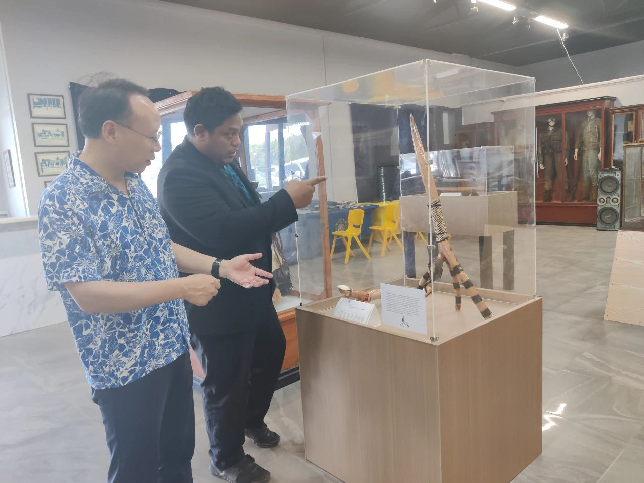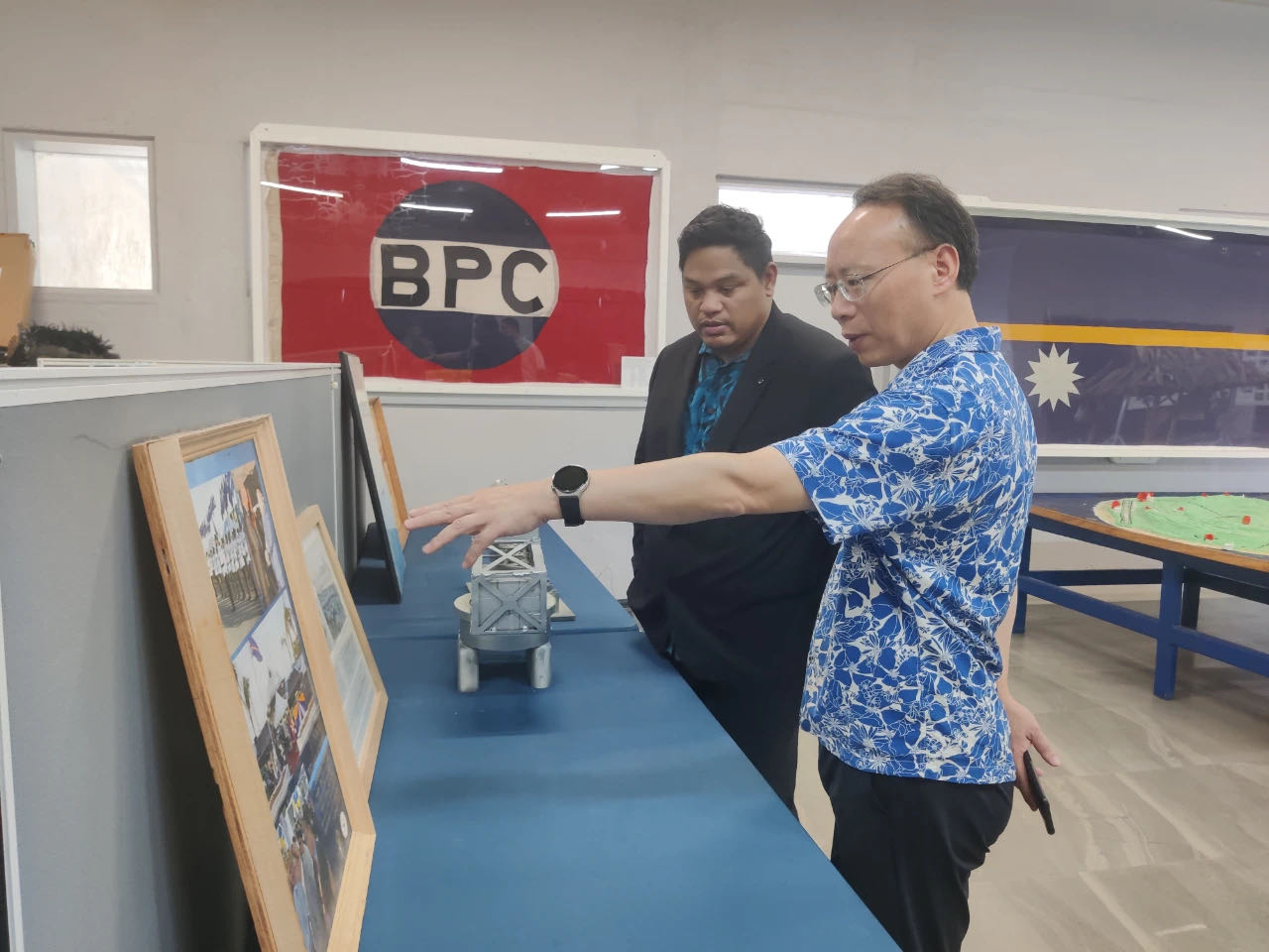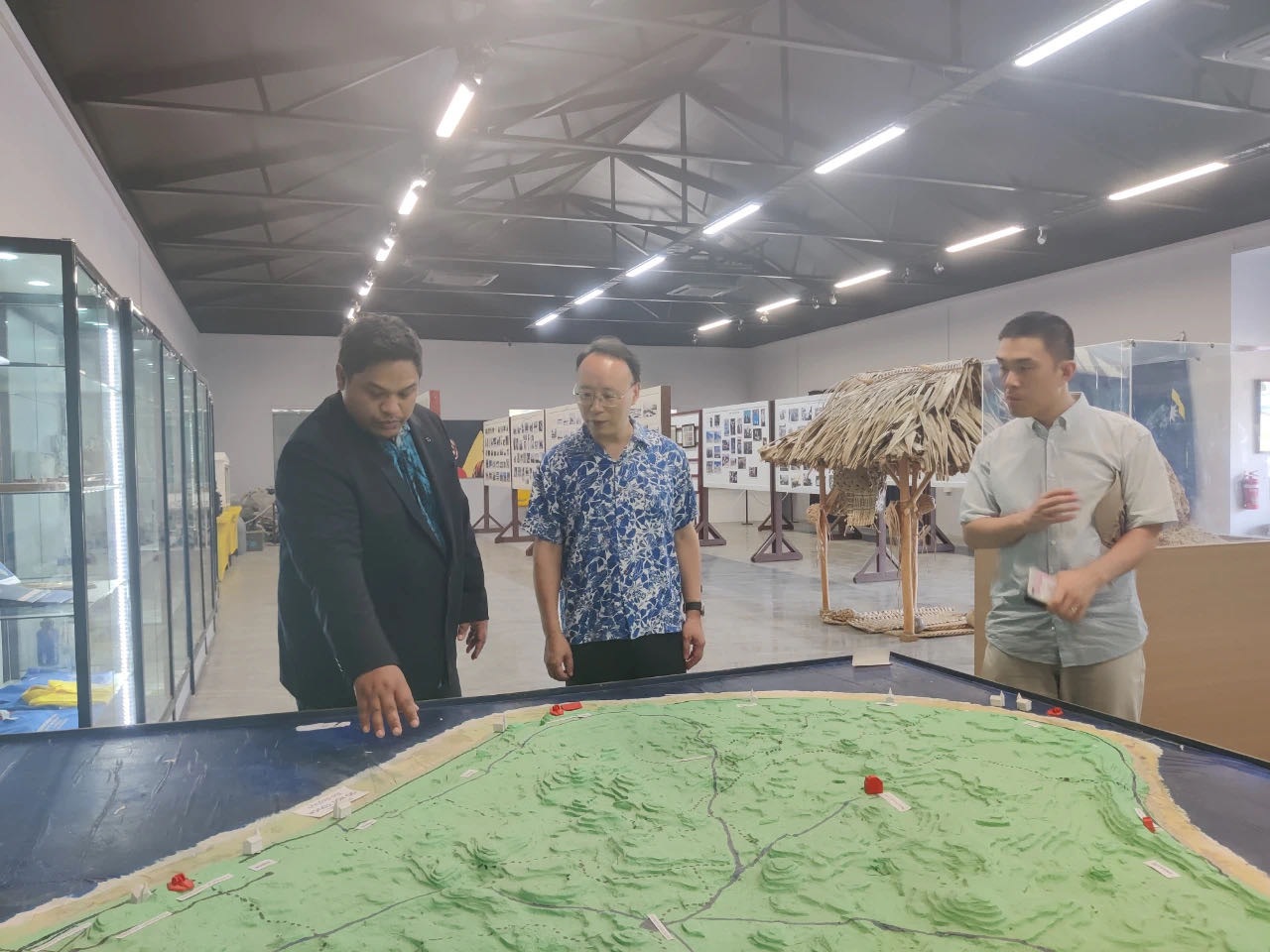 10月17日,驻瑙鲁大使吕进携我馆馆员参观瑙鲁博物馆,瑙博物馆馆长库克陪同介绍。