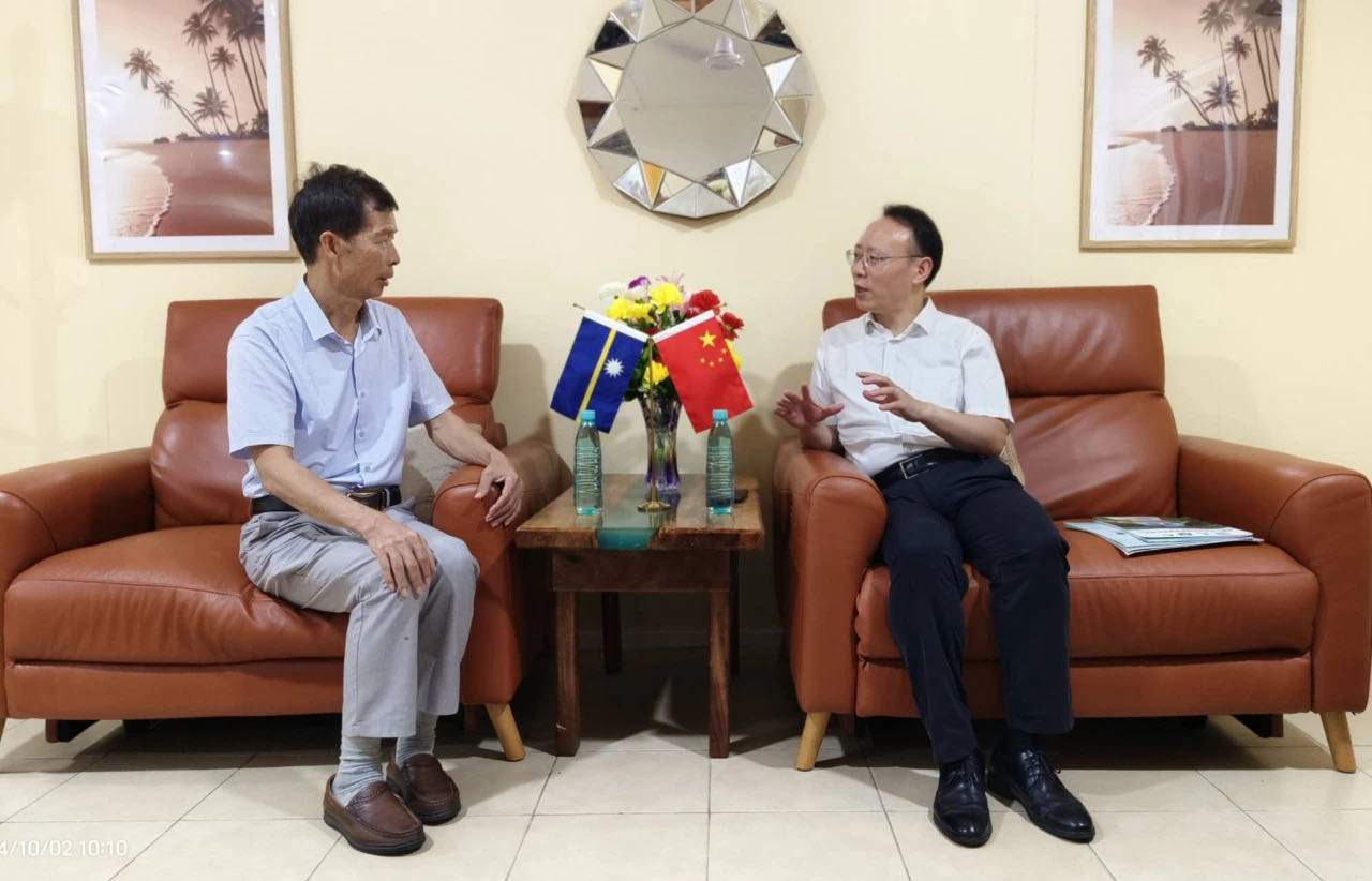 10月2日,吕进大使与中国—太平洋岛国菌草技术示范中心负责人林占森教授一行交流。