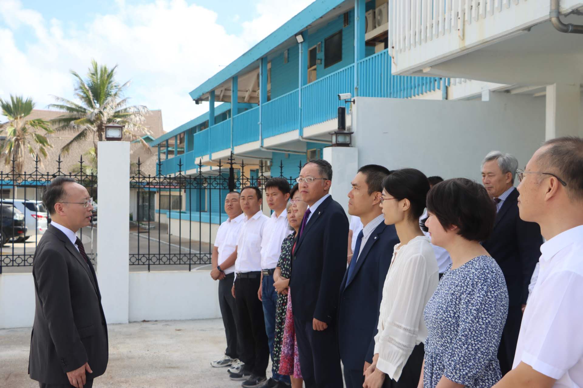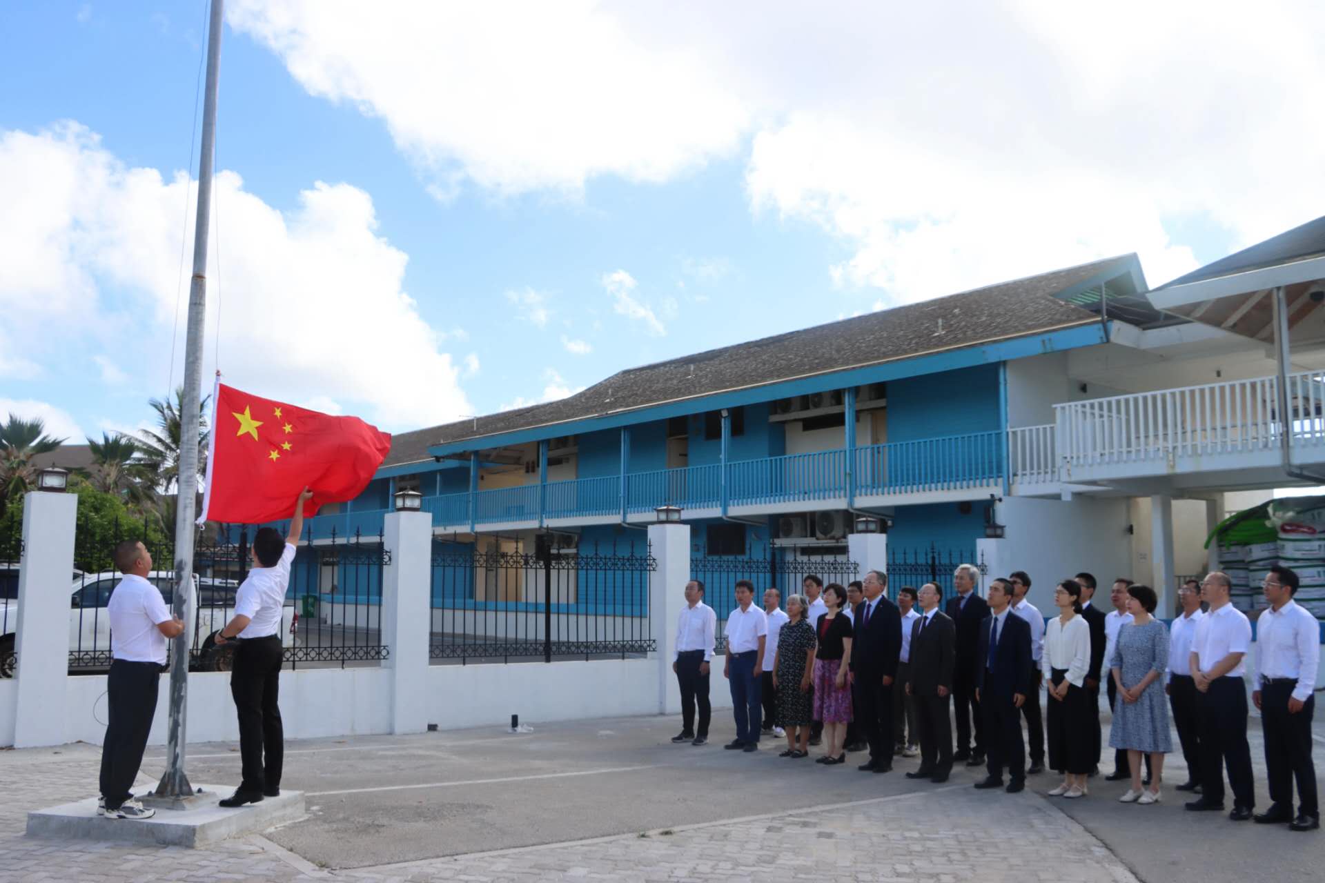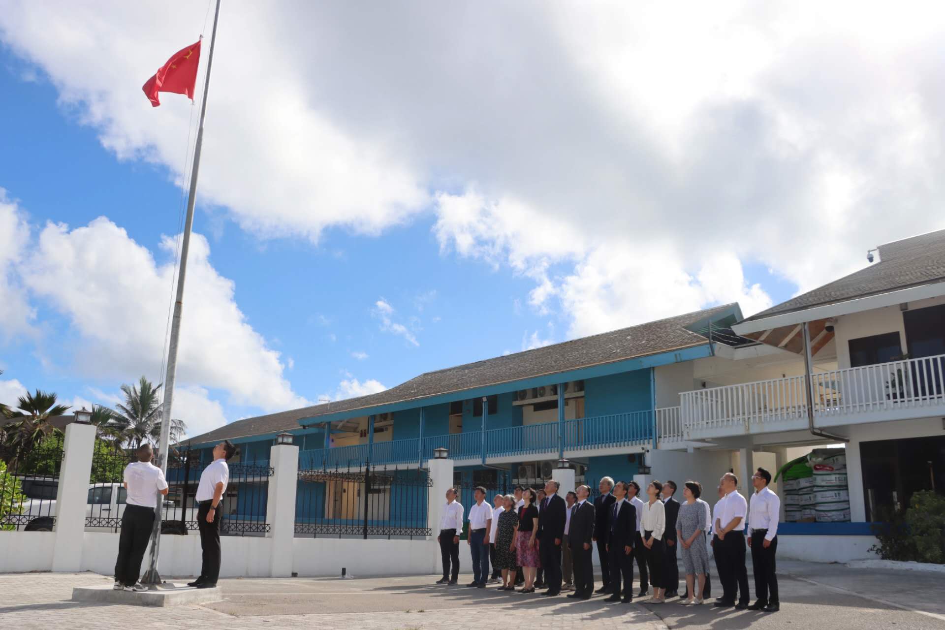 2025年10月1日上午,驻瑙鲁使馆组织在瑙中资机构代表在使馆举行中华人民共和国成立76周年国庆升旗仪式。驻瑙鲁大使吕进率全体馆员及家属、在瑙中资机构代表等参加。