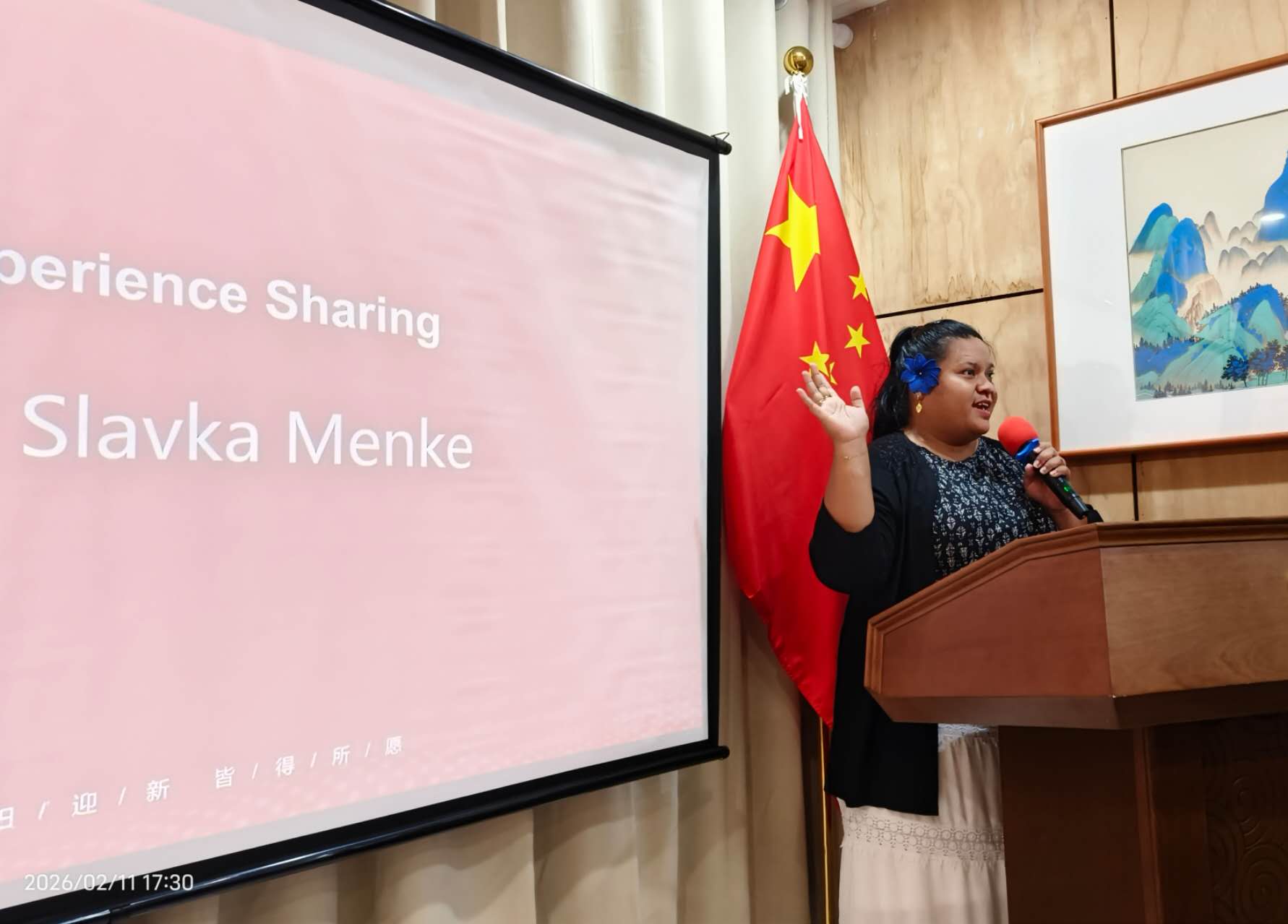 会上,使馆工作人员详细介绍中国政府奖学金申请流程、申报条件、资助内容等政策信息,邀请瑙鲁留华归国毕业生分享在华学习经历与收获体会,并现场逐一解答听众提问。