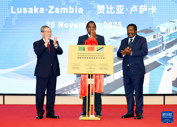 当地时间2025年11月20日,国务院总理李强在卢萨卡同赞比亚总统希奇莱马、坦桑尼亚副总统恩钦比共同出席坦赞铁路激活项目开工仪式。